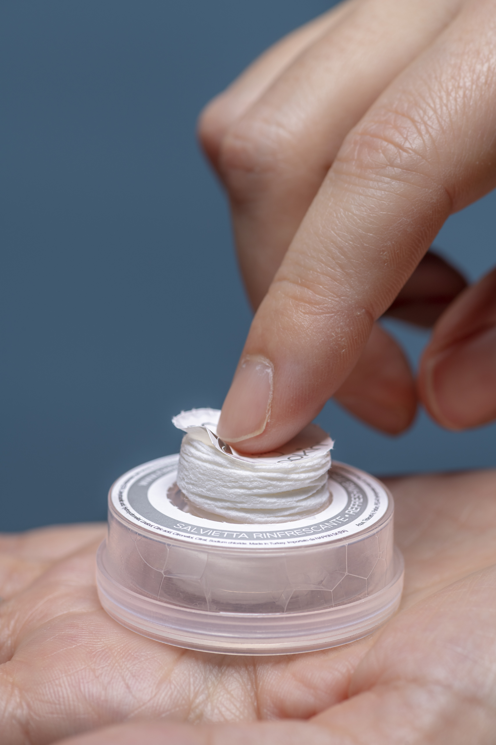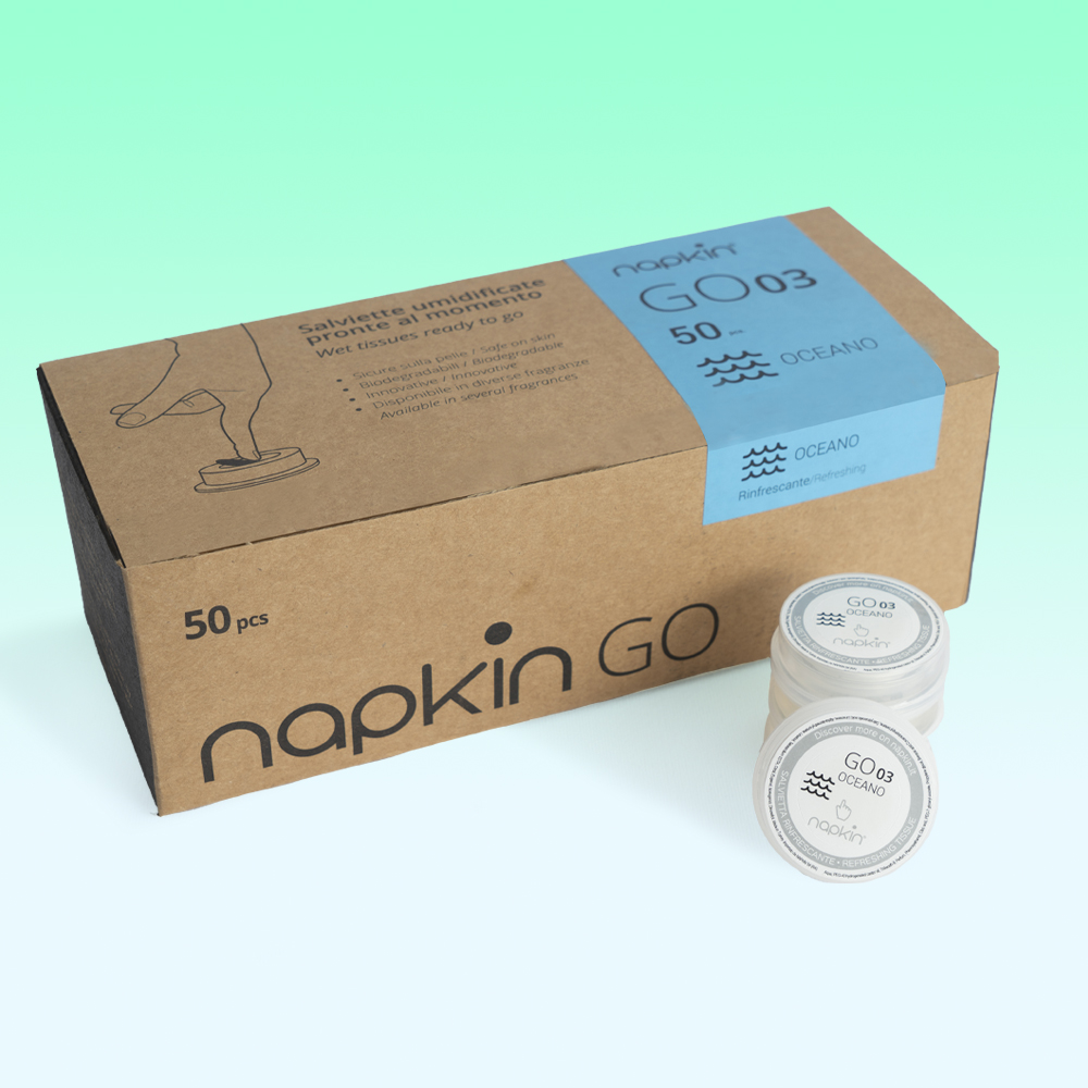 Con una leggera pressione al centro, NAPKIN® GO si attiva: il liquido contenuto nella camera esterna fluisce nel cuore della capsula, dove si trova la salvietta compressa. Questa reagendo al contatto con il liquido, si reidrata, espandendosi fino a fuoriuscire dalla capsula, pronta all'uso.